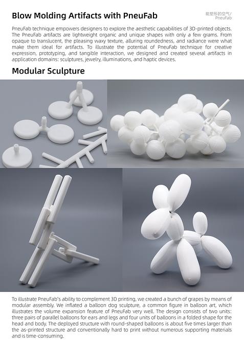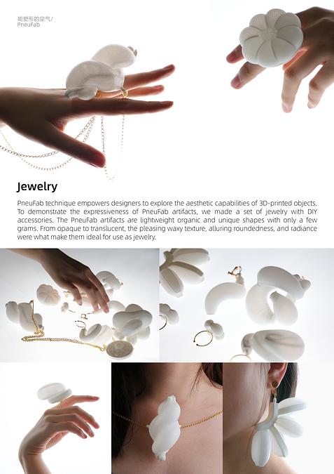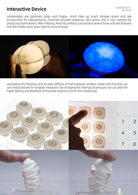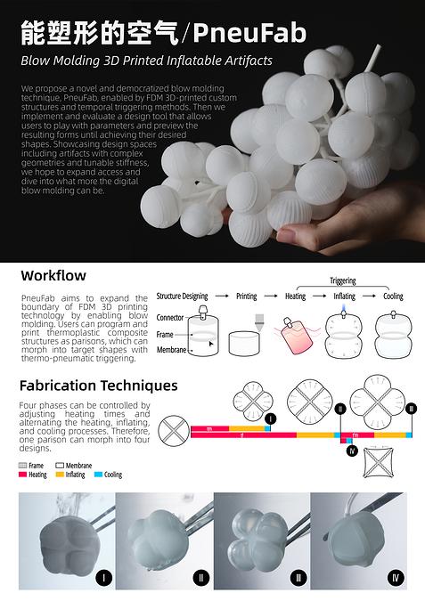 空气无形、轻盈,却具有强大的力量,从传统的吹糖人、精美的玻璃工艺品到日用塑料容器,生产者通过手工或模具,利用空气对热塑性材料进行塑形。PneuFab是受吹塑工艺启发的低门槛新型4D吹塑工艺,将 3D打印的空腔结构通过加热软化和充气,触发多阶段可控形变,实现形态各异的立体造型。该技术为个性化产品的设计与制作提供了新方法。