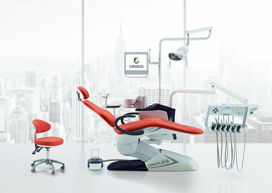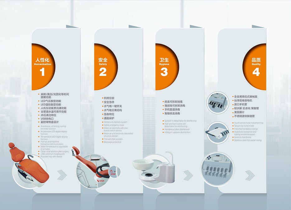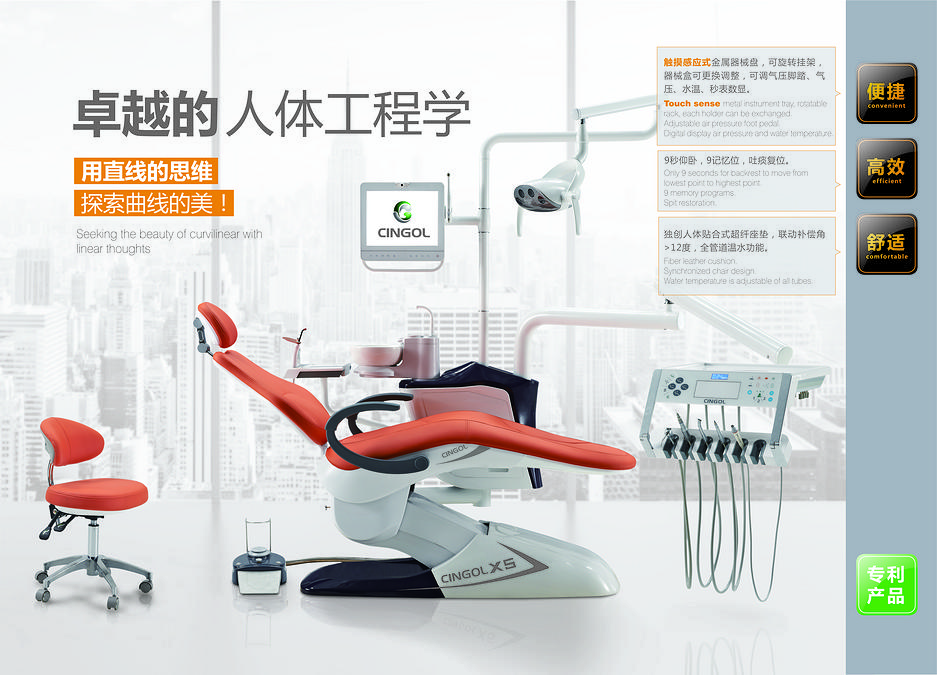 这是拥有自主专利技术的牙科椅。 符合人体工程的皮垫设计提高患者舒适度,配合经久耐用的金属器械盘和带手套也不影响的触摸操作面板,整体美观大方。专利的气压、秒表、温度显示功能方便医生操作,提高效率。独有的医患提醒功能极大提高患者的满意度。能自由调节靠背的医生椅避免长时间操作的腰肌劳损。气压可调式的脚踏配合精准度0.0001Mpa的数码显示,医生可进行局部修整,也能提高牙科手机的使用寿命。 整机采用进口品牌的电机和水气管,硅胶手机管和膜片,加厚椅架及全电泳防锈设计,已达到进口牙椅的标准,极大降低了国内高端诊所的采购费用及患者治疗费用。