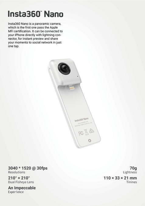 Insta360 Nano是首款通过苹果MFi认证适配iPhone的360°VR全景相机。产品也支持独立使用,小巧轻便,操作简单,能输出最高3K画质的全景内容。通过苹果lightning接口连接手机,操作app能实现实时预览并一键分享到各社交平台。外壳使用高品质铝材,经数道工序处理,拥有流线型外形,极致轻薄,贴合机身,易插易拔,手感舒适。产品包装盒既是一个VR眼镜,录制内容可直接观看。
