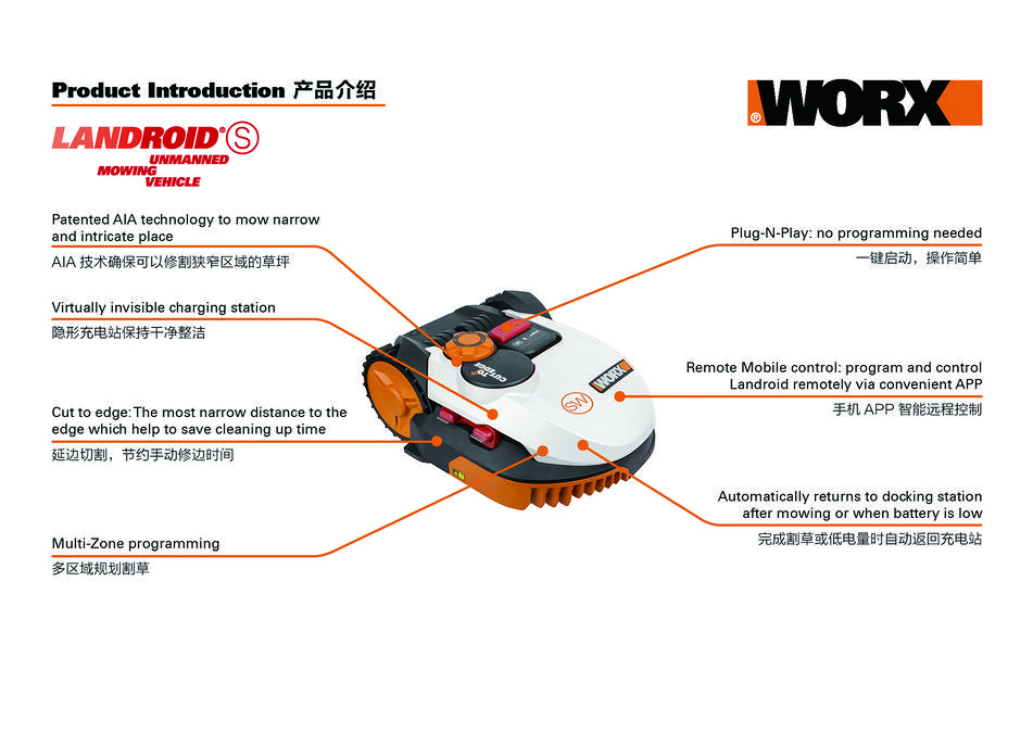 创新性:全球首创AIA技术,确保机器在狭窄区域顺利行走;智能切割技术,在狭小空间灵活高效工作;侧边充电技术,充电桩整洁干净 实用性:手机远程控制割草机工作;智能防盗系统;简单便捷的软件升级;无需编程,启动智能割草程序只需按一个按钮以用户为中心的机身操作界面设计,实用、直观、美观,操作过程便捷、简单 环保性:锂电池技术,循环寿命长,安全性能好,无公害,无记忆效应,有效减少电池对环境污染的危害 工艺性:壳体采用ANS材料,不褪色;采用灌胶工艺,提升智能控制系统三防性能 美观性:机身摒弃传统暗色调大胆使用洁净的白色,搭配橙色操作部件及醒目的logo使整机多了几分精致与亲昵