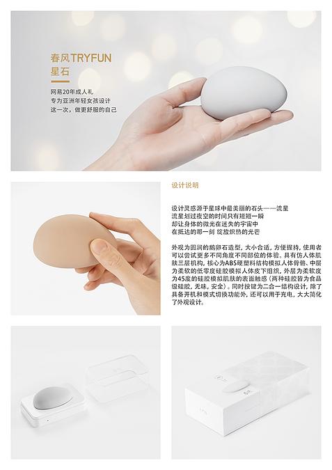 外观为圆润的鹅卵石造型, 大小合适,方便握持,使用者可以尝试更多不同角度不同部位的体验。具有仿人体肌肤三层机构, 核心为ABS硬塑料结构模拟人体骨骼、中层为柔软的低零度硅胶模拟人体皮下组织,外层为柔软度为45度的硅胶模拟肌肤的表面触感(两种硅胶皆为食品级硅胶,无味,安全)。同时按键为二合一结构设计,除了具备开机和模式切换功能外,还可以用于充电,大大简化了外观设计。