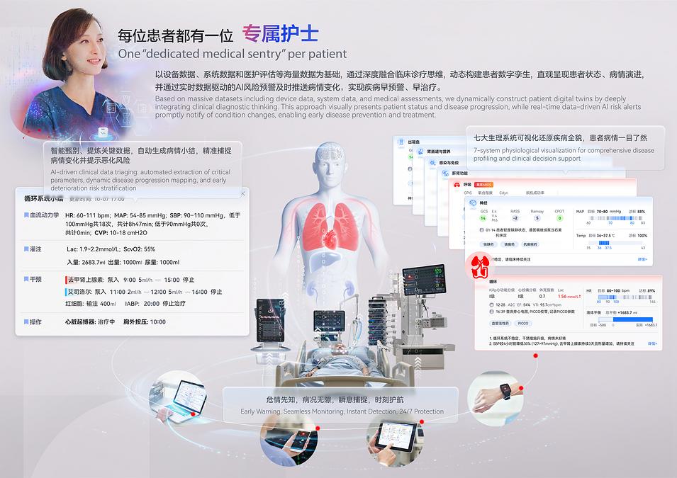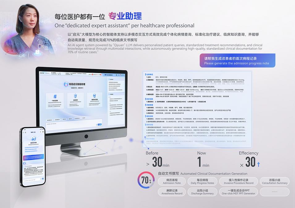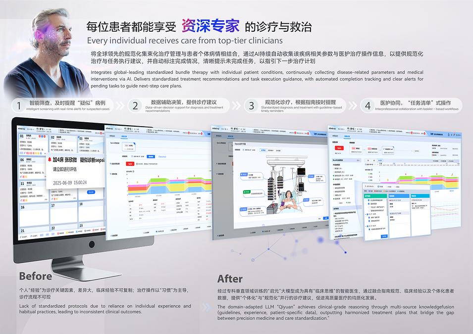 瑞智临床决策辅助系统以“启元”大模型为核心重塑临床生产力:1.全球首个临床落地重症大模型,实现24小时智能监测与预警;2.基于临床诊疗思维训练,为多个重症提供95%准确率的诊疗建议;3.一分钟生成规范文书,效率提升30倍。该系统已在多家三甲医院应用并持续优化,显著提升诊疗质量,真正实现把时间还给医护,把医护还给病人。