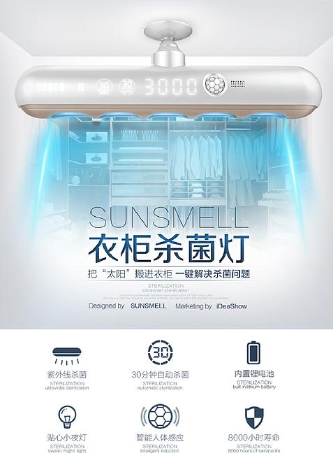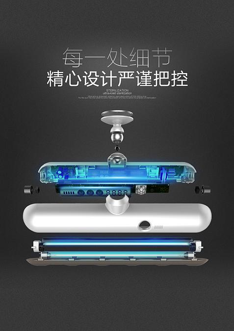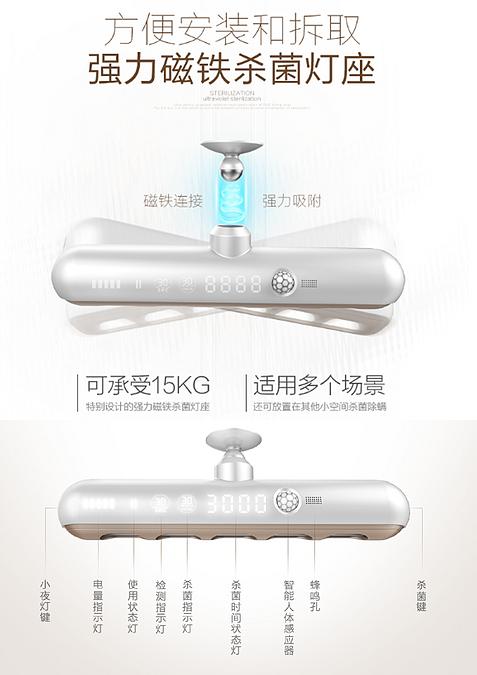 这是一款小空间使用的杀菌灯。 该产品特点在于适用于小空间杀菌、除螨,除甲醛,防霉,且不会人体产生伤害。产品设有小夜灯,充分考虑了杀菌灯所在衣柜等环境的照明需求。采用充电可移动的方式,满足了杀菌灯在使用过程中对所在环境需要电源的要求。
