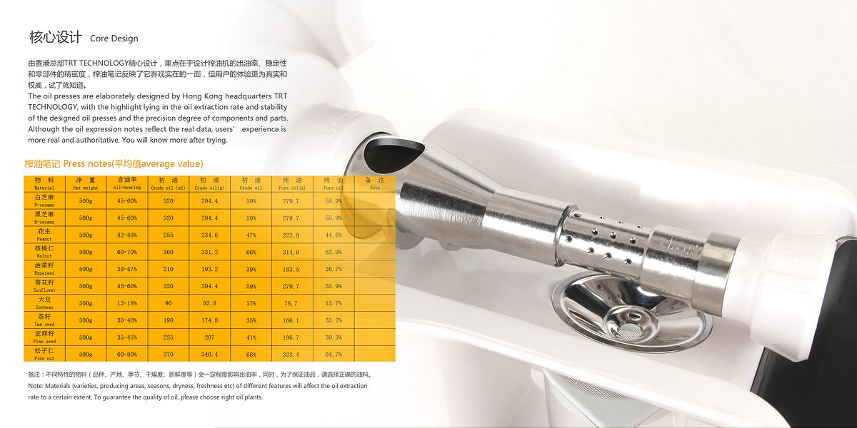 这是一款操作简单,高度出油,易于清洗的智能家用榨油机。产品将榨油步骤简化为翻盖式,一键智能榨油,同时运用螺旋式镗杆挤压原理,将油、渣高度分离,出油率达到95%以上。此外产品部件可徒手取下,方便清洗。