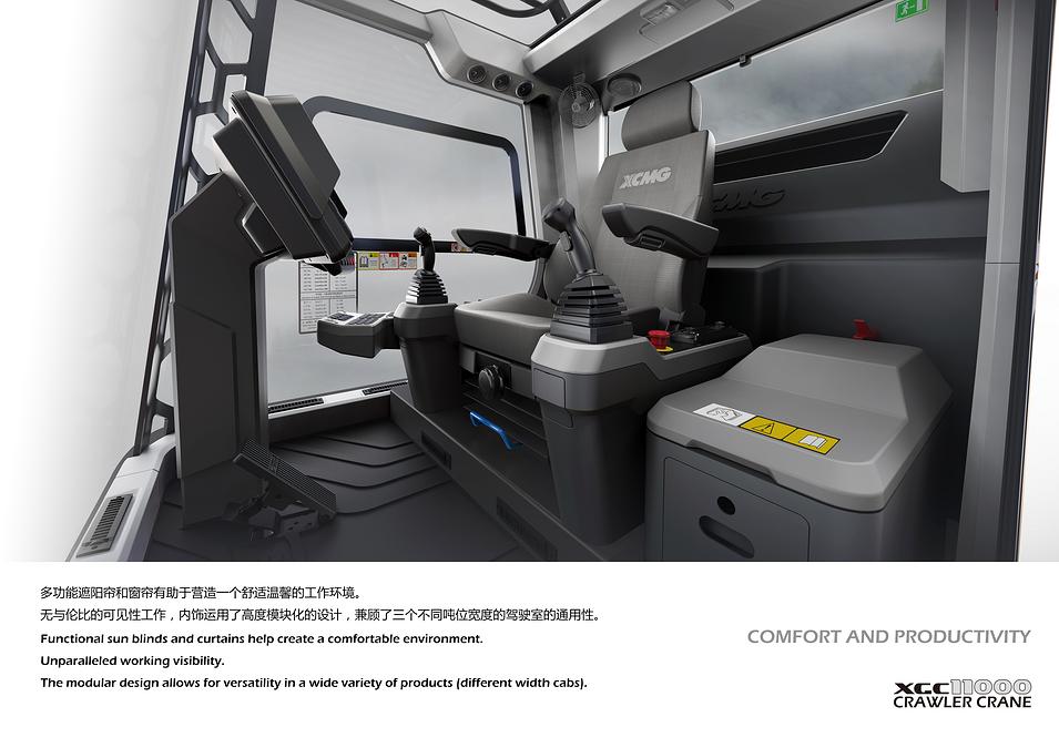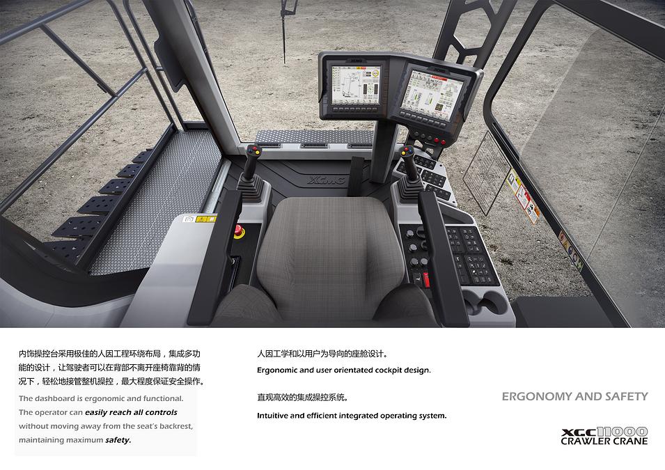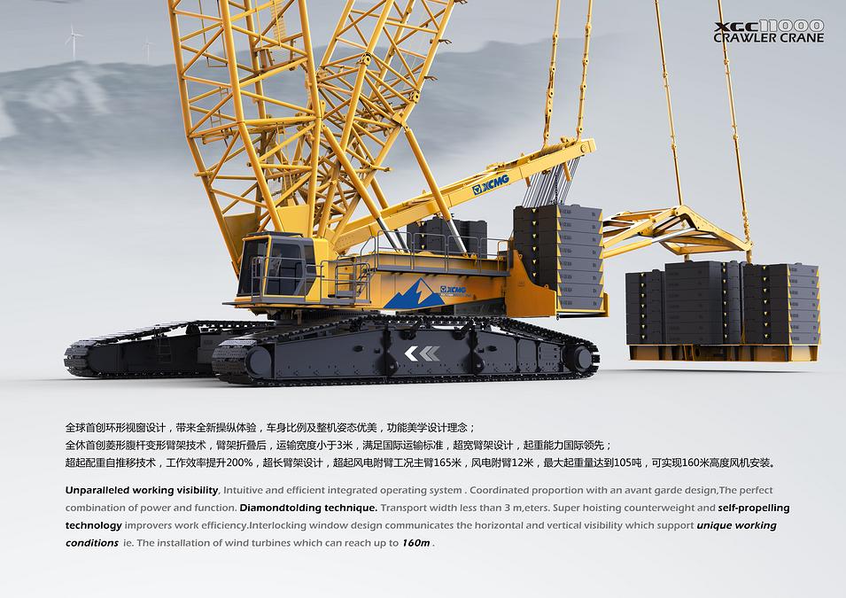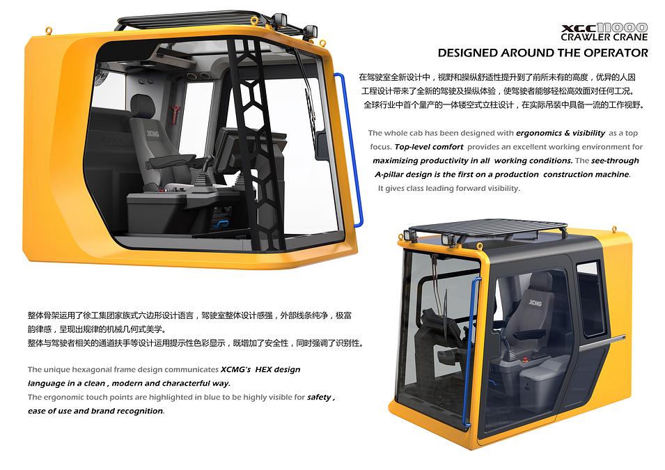 XGC11000履带起重机是徐工依托60余年起重机制造经验,针对新能源开发利用倾力打造的一款性能先进、高效节能的划时代产品。整机独立自主研发,菱形臂架折叠技术、整机分体及快拆、折叠式超起配重推移装置等设计均为全球行业首创。它通过一流的人体工程学设计,打造以操作人员为中心的环绕式驾驶室布局,营造高度舒适的操纵环境;六边形元素的透视A柱具有极高的向前可视性、可识别性,同时体现了工程机械的独有设计美学。
