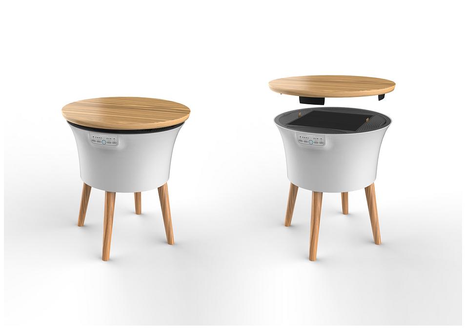 这是一款绿色环保的茶几。该产品以减法设计为出发点,整体设计呈现简约大方的设计风格。它完成了家具对电器的完美整合,是全季节型的绿色环境电器,减少重复的电器消耗,符合节能减排、绿色家电的设计发展趋势。空气茶几集合了空气净化、置物等多种功能,使得它真正成为全季节型的环境电器。