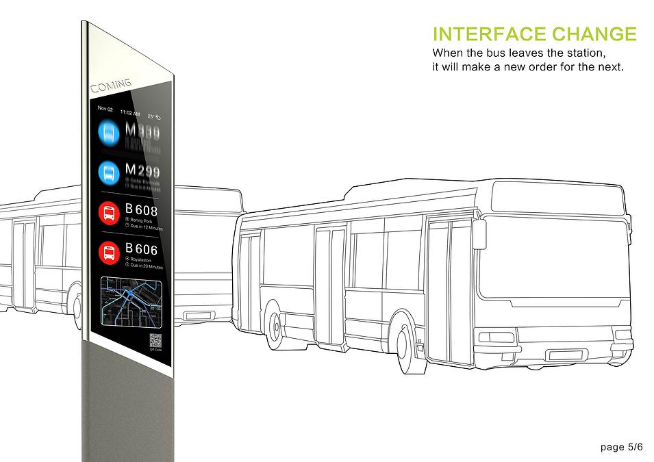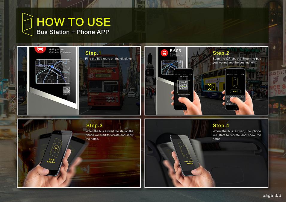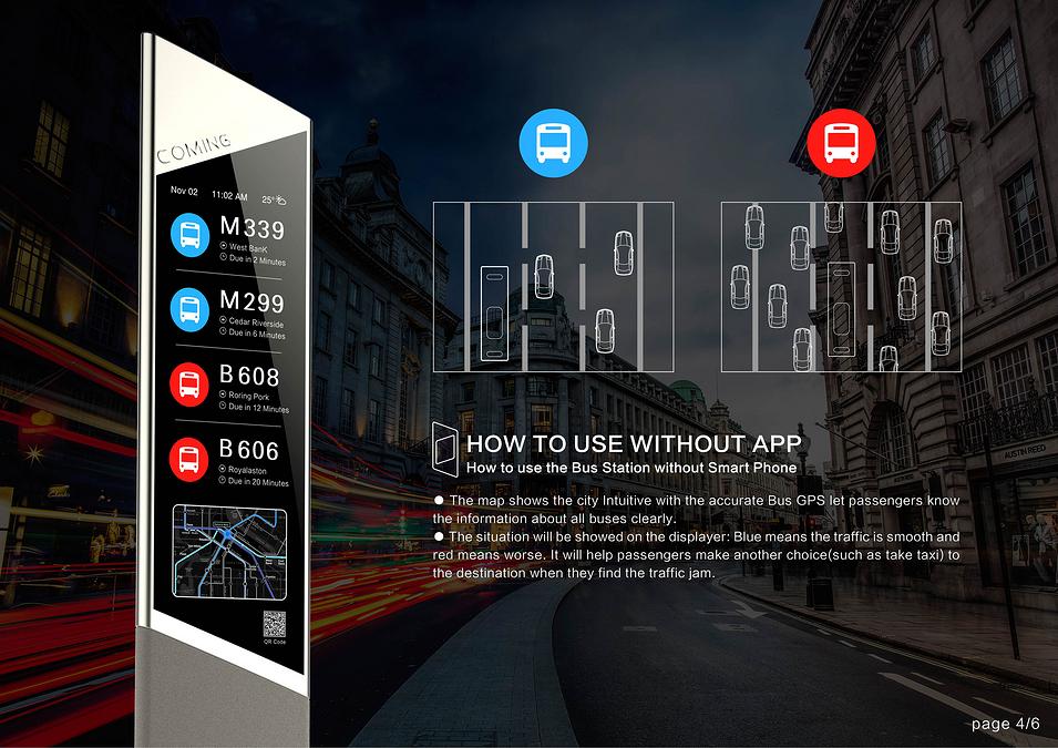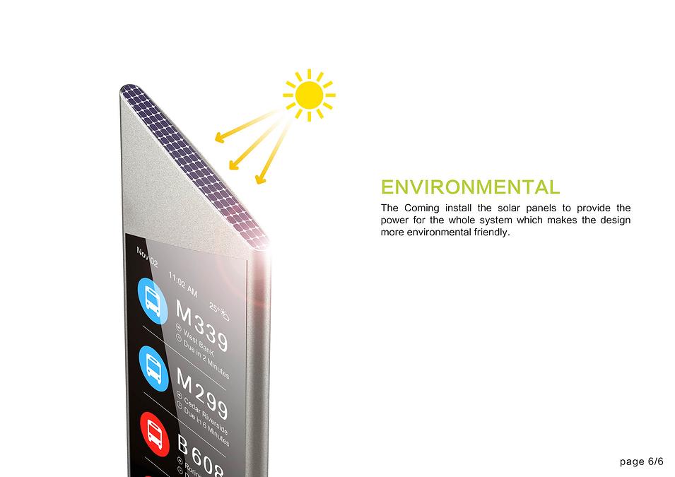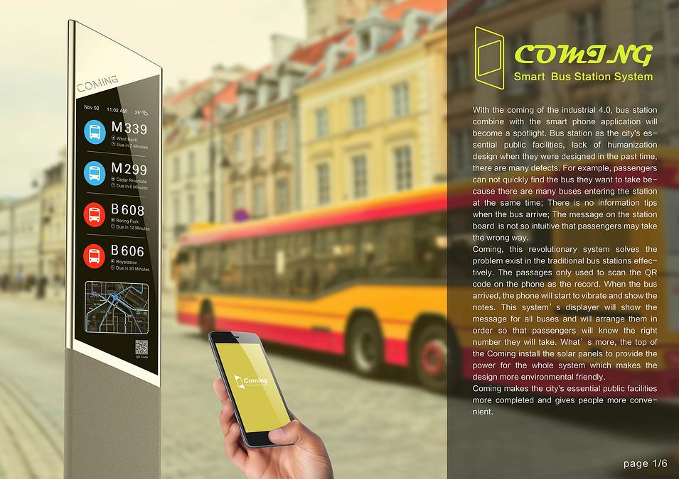 随着工业4.0的到来,公交车站和智能手机App结合的想法将会成为一个热门话题。 『Coming』这个革命性的公共设施系统有效地解决了传统的公交车站存在的问题。乘客只需用手机扫描设施上的二维码,作为登记搭乘的记录,当公车到达时,乘客手中的手机会震动并弹出提醒图案。该设施的显示屏上会显示各路公车的路况与到达时间,同时将进站的公车进行排序,乘客可直接知道自己要搭乘的公车是第几台。另外,『Coming』的顶部装有太阳能电池板,为整个公车站台系统提供电能,使得设计更加环保。『Coming』使得城市公共设施更加完善,为市民提供更多的便捷。